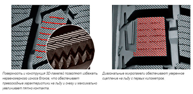 Большая часть сцепных свойств на льду обеспечивается не дизайном протекторного рисунка, а некоторыми свойствами резиновой смеси. В ее состав входят компоненты, позволяющие шине впитывать влагу с обледенелой поверхности. Такое «подсушивание» пятна контакта обеспечивает 100-процентное использование всех возможностей беговой части протектора. Кроме того, в состав компаунда входят специальные полимеры. С их помощью шина буквально прилипает к обледенелому покрытию, максимально плотно облегая даже самые незначительные неровности. Данное свойство сохраняется даже при очень низких температурах внешней среды. Оценить эффективность, по сути, нового компаунда можно по результатам тестов. В сравнении с предшественницей данная модель демонстрирует на четверть меньшую протяженность тормозного пути на льду.
